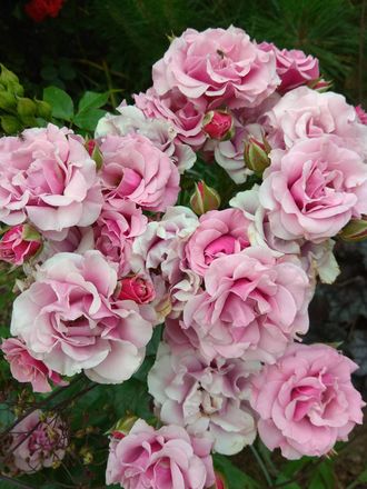 Огромные по количеству, соцветия-букеты (от 5 до 30 цветков) розово-лилового цвета, с волнообразным лепестком. Цвет их варьируется в зависимости от освещённости от лилового до светло-розового. Куст сильный, компактный высотой 60-80 см. Листья темно-зеленые, блестящие, яйцевидные, с мелко-зубчатыми краями. Цветение обильное, длительное - с начала и до конца лета. Практически без шипов и запаха