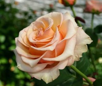 Роза обладает нежнейшим, практически нейтральным ароматом. В бутоне 20-25 лепестков яркого абрикосового оттенка с легкими нежно-розовыми тонами. Края цветка несколько рыхлые. Лепестки имеют махровую текстуру. Роза "примадонна" отлично переносит температурные колебания, ей не страшны жаркие дни и осенние заморозки, хотя на зимний период рекомендуется утеплить цветок. Также растение устойчиво к различным заболеваниям. Цветение повторное и обильное. У этой розы середина бутона никогда не раскрывается. Куст цветет своеобразными волнами. При раскрытии цветок достигает 9 см в диаметре.