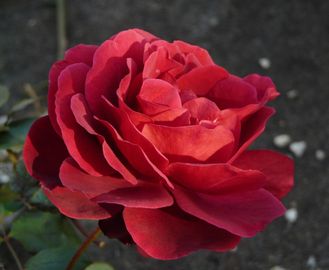 Главная палитра – бордово-красная с тёмными тонами. Но в целом эта роза относится именно к красным. По очертаниям цветок похож на бокаловидный раскрывающийся бутон. По размеру эта культура относится к крупным цветам: диаметр цветка колеблется от 10 до 12 см. Благодаря наличию 56 лепестков данный сорт отнесен к густомахровым. Располагаются цветки либо по одному (чаще всего очерёдно), либо в небольших соцветиях (по 2-3 бутона). Запах цветка – фруктовый, в частности, напоминает абрикосовые и персиковые ноты. Сильно выраженные по своему аромату цветки Эдит Пиаф привлекают множество поклонников, которым нравится именно фруктовый запах. Пестроты и двухцветности не обнаружено: цветки не имеют характерной для этого параметра окантовки по краям.
