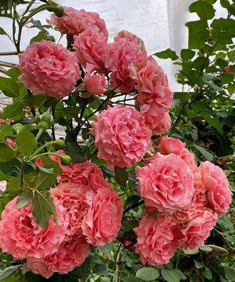 Коралл Желе в цвету вызывает восторг у всех, кто ее видел, и полностью оправдывает свое название. Форма крупных (8-10 см) махровых (26-40 лепестков) цветков является чашевидной. Цветочек обладает интенсивно-розовым окрасом, и при этом селекционерам удалось добиться визуального эффекта полупрозрачности, воздушности и невесомости. Собранные в букетовидные соцветия бутоны действительно напоминают желе в розовой чаше, издают приятный аромат личи, достаточно интенсивный, чтобы наполнить сад благоуханием.