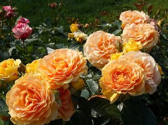 Плотные ярко-оранжевые бутончики сформированы в соцветия (3−5 шт.), а после распускания они становятся махровыми, ностальгическими, переливчатыми золотисто-янтарными цветками средних размеров (6-10 см диаметром). В основной оранжевой окраске цветков зачастую заметны медные нотки. Лепестки немного гофрированные (примерно 25 шт. в бутоне). Цветки источают ненавязчивый и сладкий фруктовый аромат и красиво выделяются на фоне оливково-зеленой глянцевой листвы.