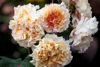 Бокаловидный бутон кремово-абрикосового цвета распускается густомахровым цветком с тугой структурой, состоящей из 50-80 лепестков. Чашевидная роза достаточно крупная – диаметр около 12-15 см. Окрас у цветка необычный – кремово-абрикосовая основа разбавлена желто-золотистыми оттенками, сконцентрированными в центре розы. У полностью распустившихся цветов внешние лепестки слегка выворачиваются наружу. Цветущие кустарники издают легкий и приятный аромат, в котором четко прослеживаются нотки свежести и фруктов.